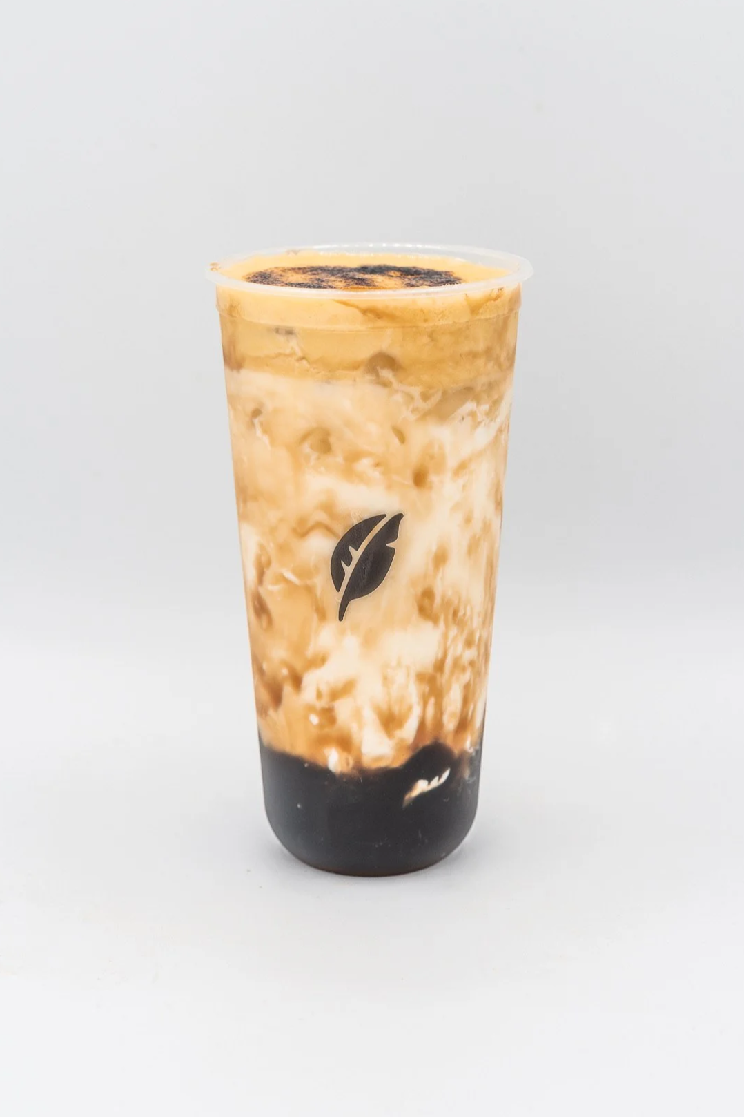 Our caffeinated take on our classic Crème Brûlée. Our team hand-separates hundreds of egg yolks per batch to create our house-made custard creme. Real egg yolks, cream, and sugar are emulsified and tempered using a Bain-Marie to create our signature Crème Brûlée foam. We then dust the top with sugar and torch it for that satisfying crack. Must select topping to add Boba